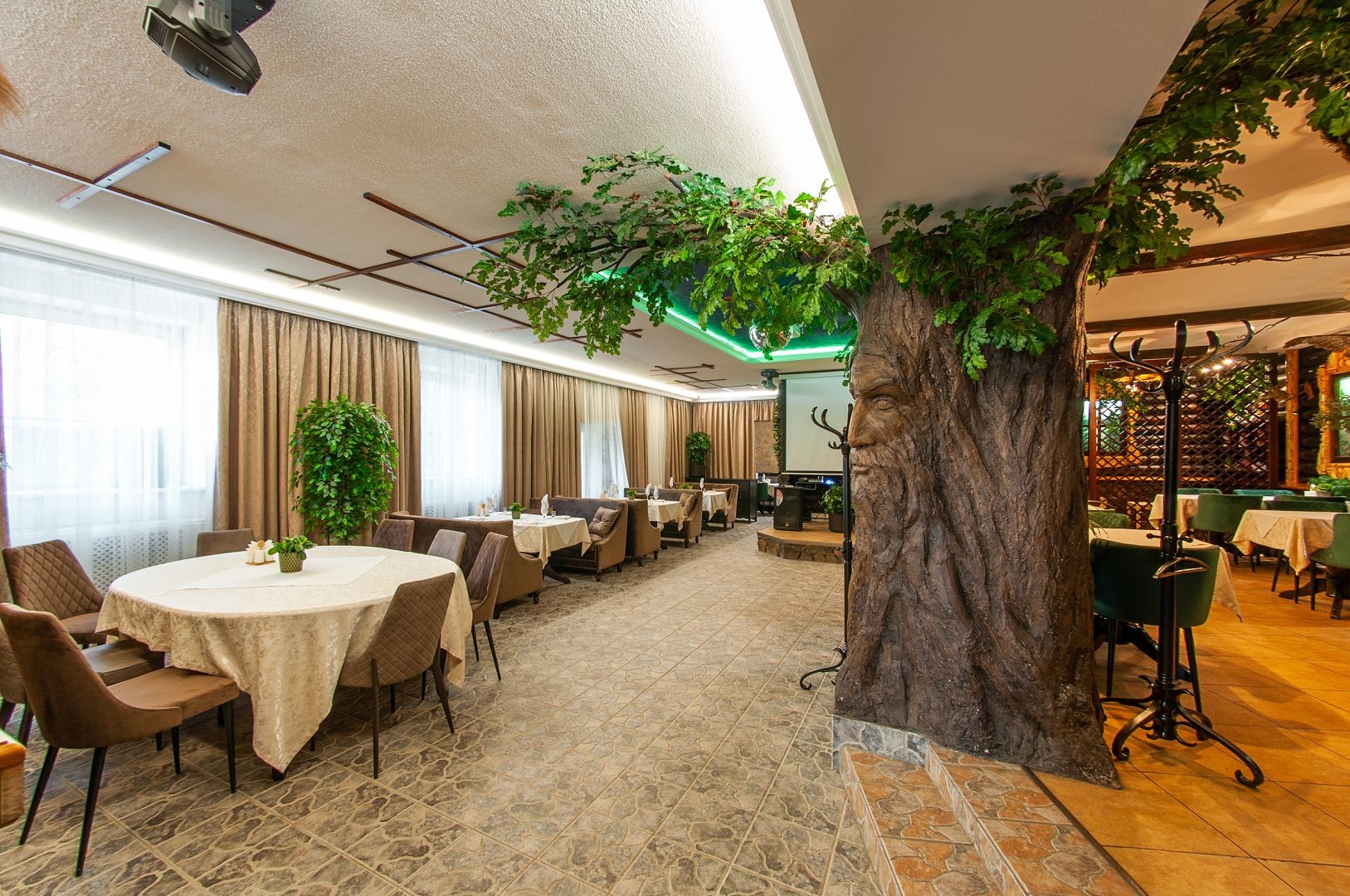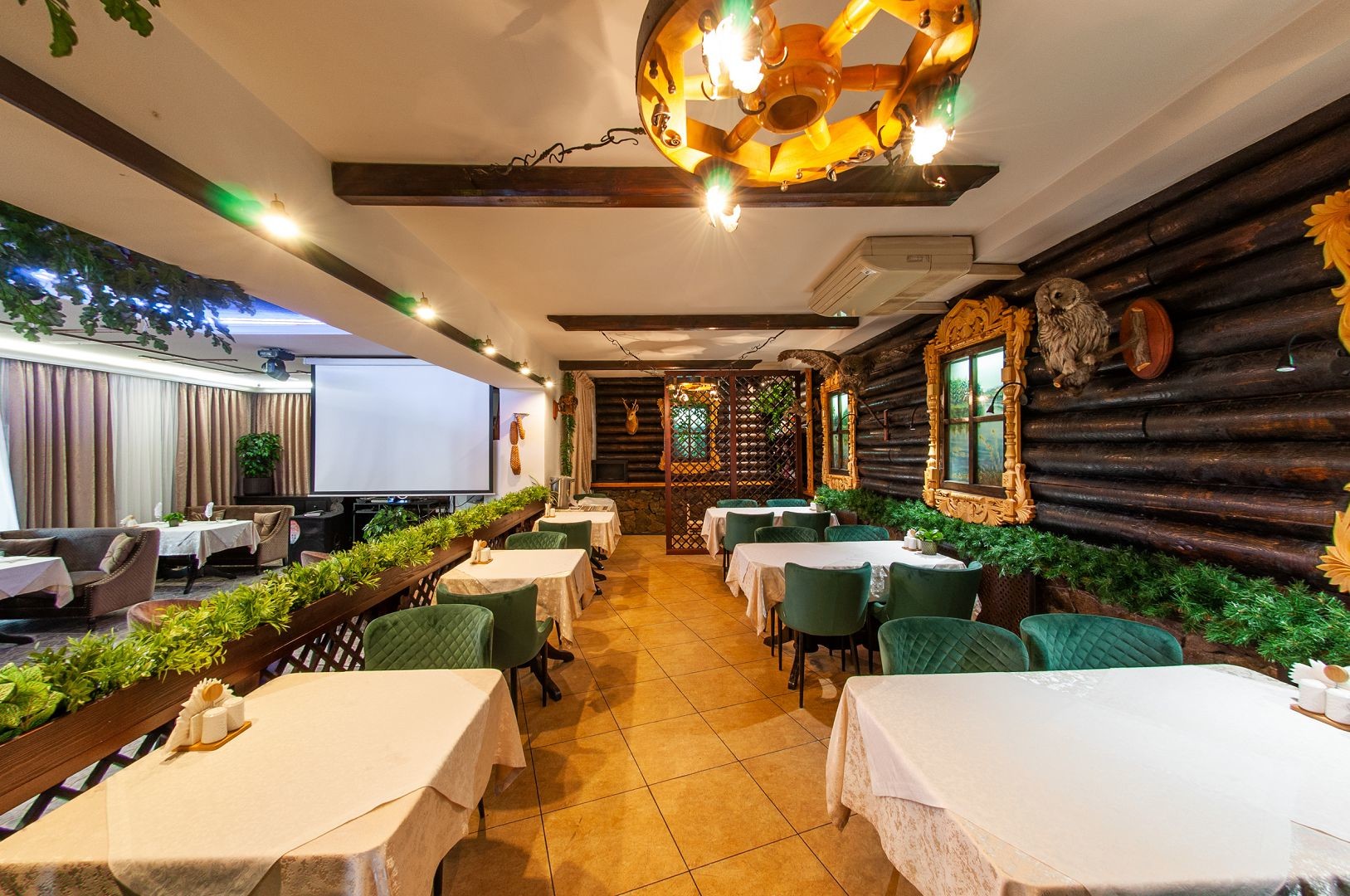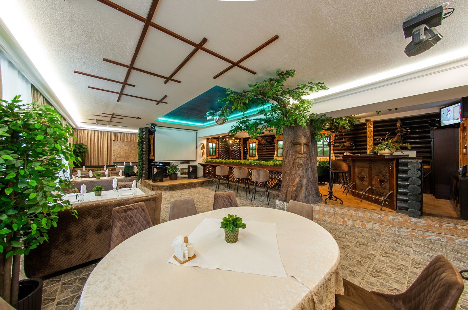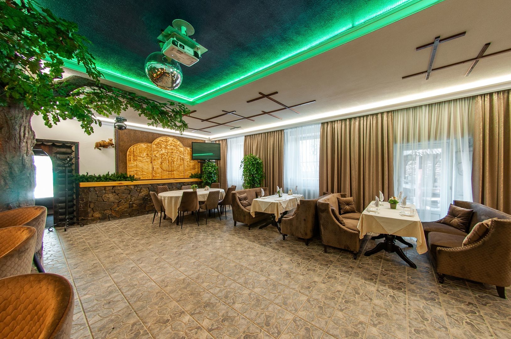 Для проведения развлекательной программы в банкетном зале есть всё необходимое оборудование: музыкальная аппаратура, TV экраны, интернет.